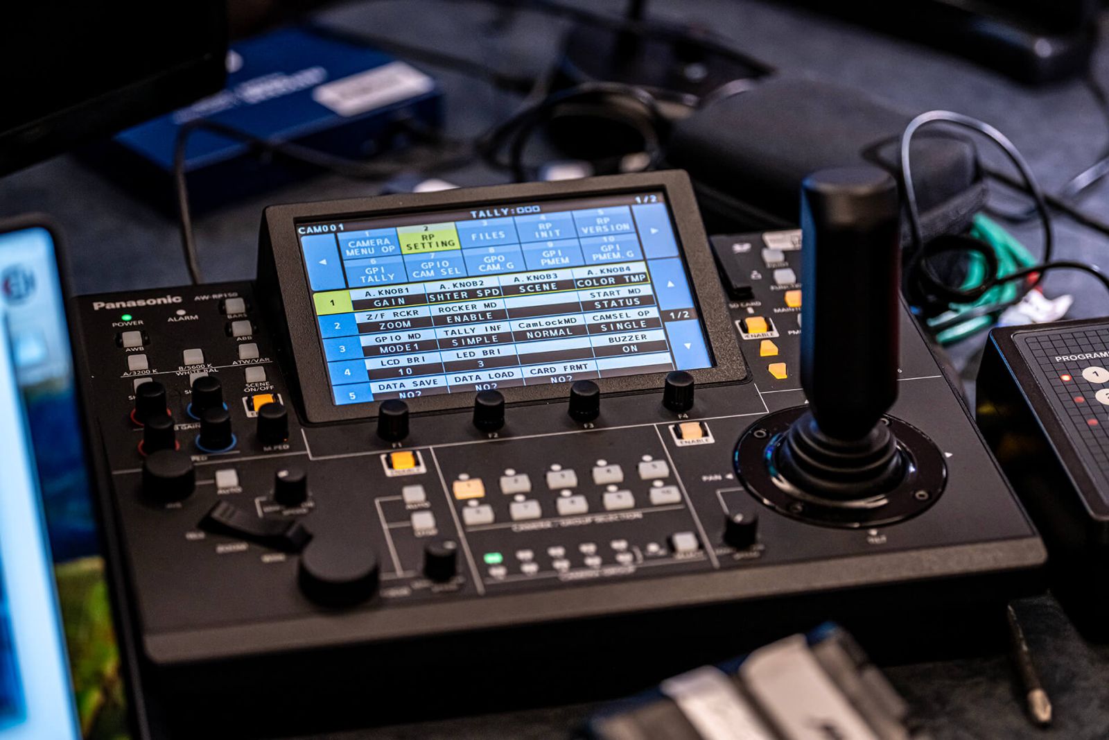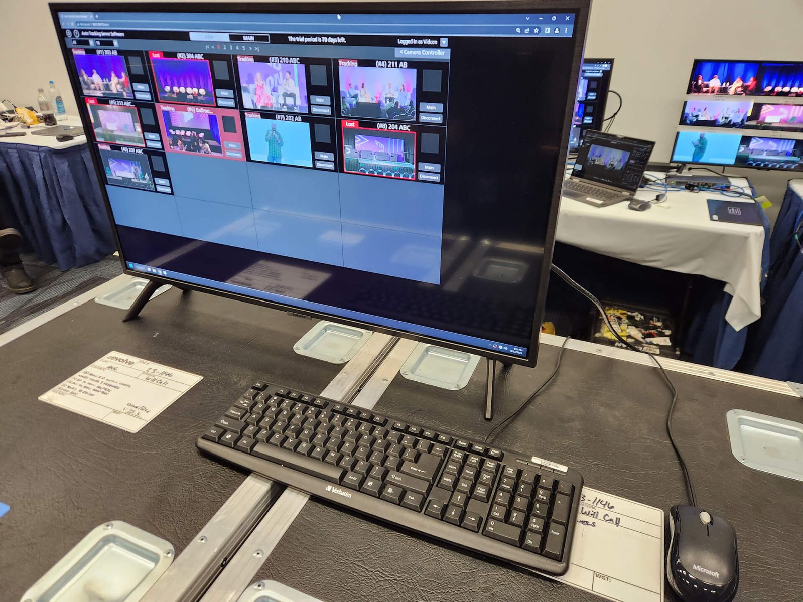 The crew discovered that the live video feed monitoring built into the software was a very low frame rate making it difficult for the technicians to smoothly control the cameras and verify image quality for the nine break-out rooms. Loeffel and the techs worked around that issue by utilizing the UE150s built in ability to stream a low-latency video feed from the cameras into a laptop and building a nine window multiviewer.