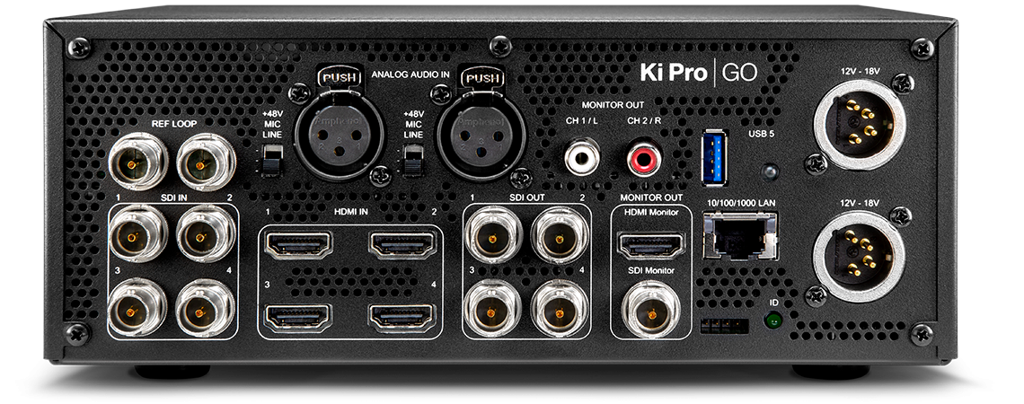 4x 3G-SDI and 4x HDMI digital video inputs with flexible channel assignments provides connections to the latest video sources, including cameras and DSLRs. Incoming video sources do not have to be genlocked due to Ki Pro GO’s input frame syncs. Ki Pro GO also features AJA’s high quality de-interlacers on each input so progressive recordings can be made from interlaced inputs. High quality 2-channel embedded audio or balanced XLR analog audio can be assigned to any recording channel. Multi-Channel Matrix Monitoring enables multiple video channels to be viewed on any single HDMI or SDI display, and Enhanced Super Out offers timecode, media status and audio meter overlays over the SDI and HDMI monitor outputs.