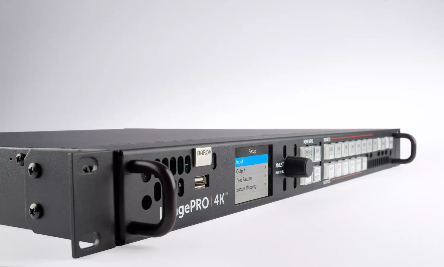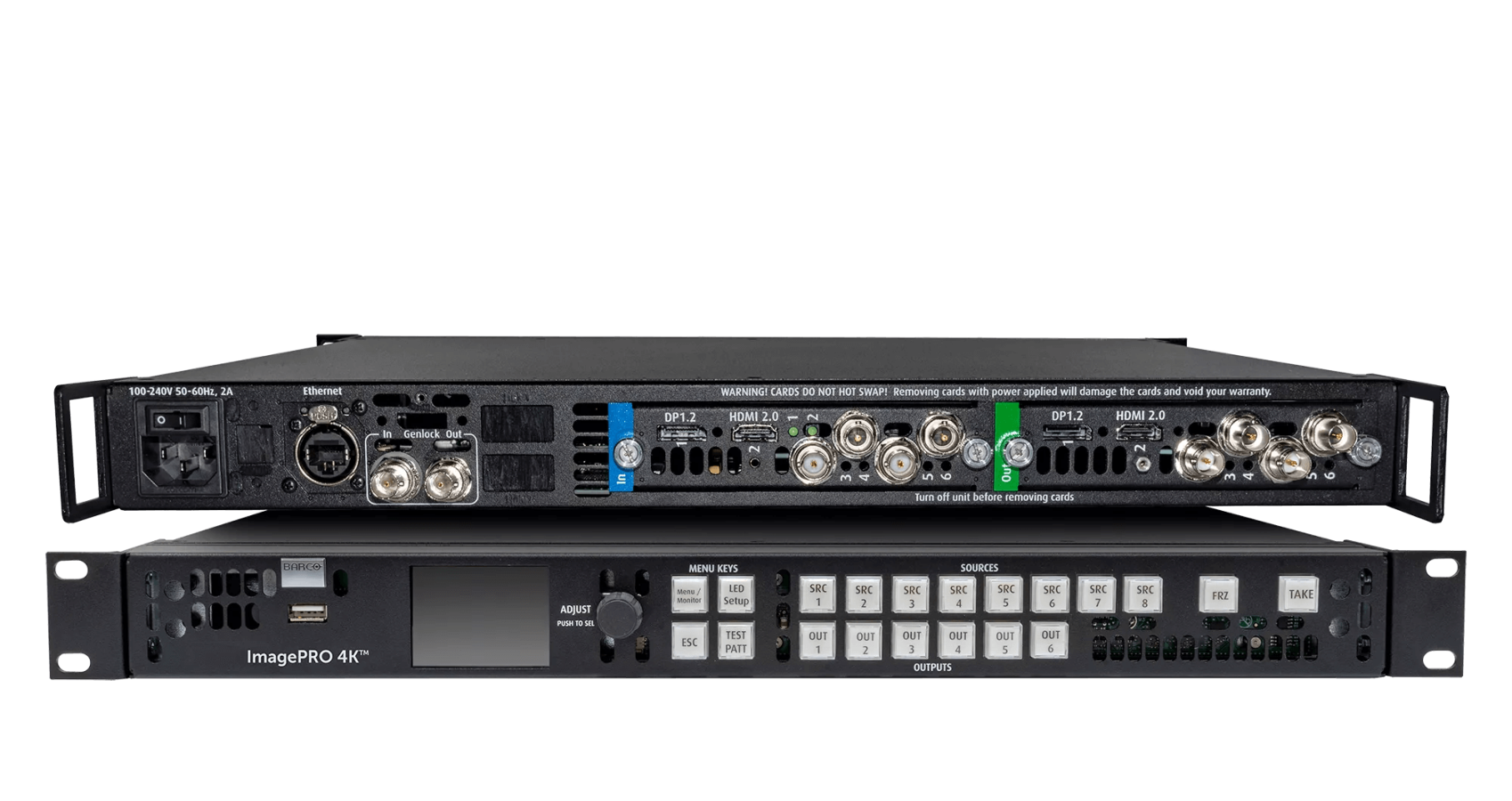 Superb performance ImagePRO revolutionized live events in 2004. ImagePRO-4K goes even further as it easily scales, converts and switches the highest quality signals without latency (4K, 4:4:4, 60p, 10-bit), effectively solving glitches before they even occur. The latest I/O connectors enable you to seamlessly convert HDMI 2.0, DP 1.2 and 3G-12G SDI signals while also enabling output image rotation. Put simply, the flexibility and power of the ImagePRO is the backbone on which you build shows that run without a hitch. Road-ready and reliable Like all Barco image processing products, the ImagePRO-4K is built for life on the road. Assembled and tested for extreme use and abuse, the ImagePRO performs just as well at the gig as it does in the shop. What’s more, the live-source view on the front panel provides you with a clear view of the incoming signal giving you the confidence you need to execute your event flawlessly. LED at your fingertips Need to slice and dice LED signals? The ImagePRO-4K does it with ease. Either chop up single inputs across several connectors, or drive multiple walls from multiple sources. The LED set-up menu will guide you through the process to achieve pixel perfect images. The 12-bit internal processing handles pre-scaling or cropping to an LED wall’s actual resolution – in perfect detail.