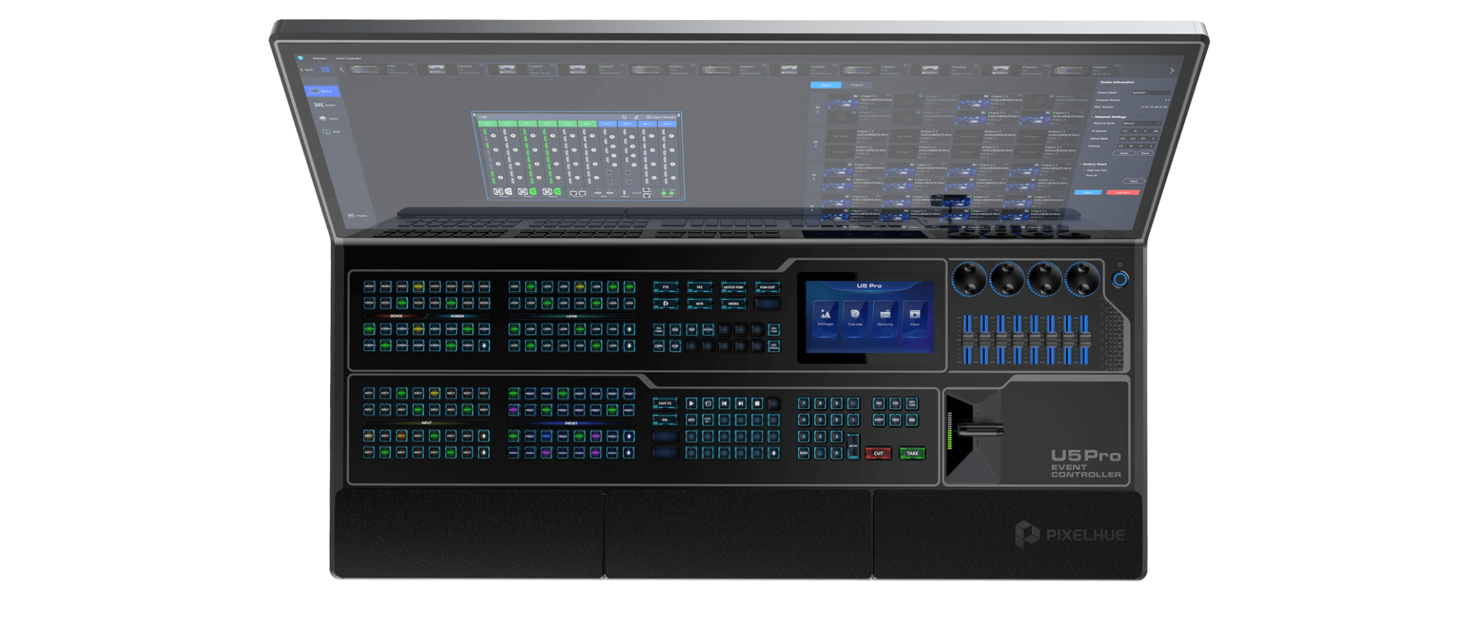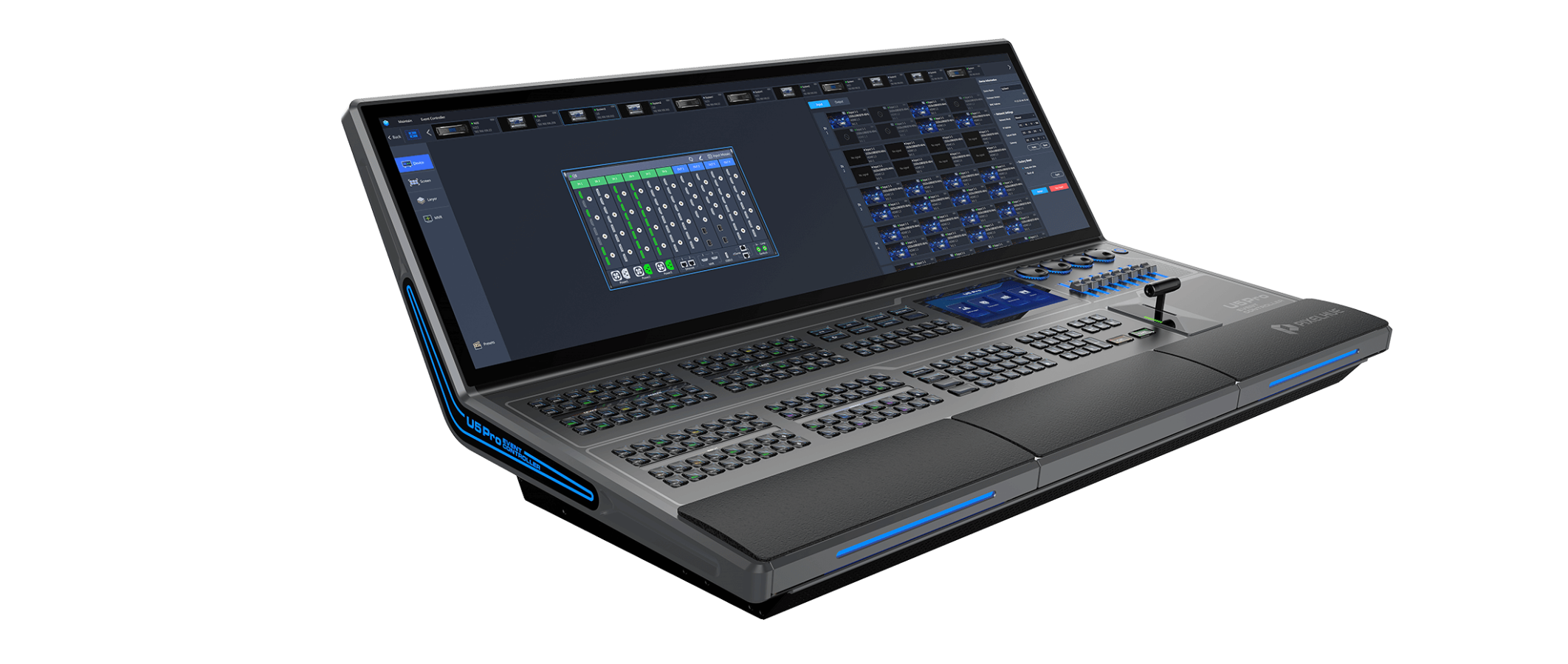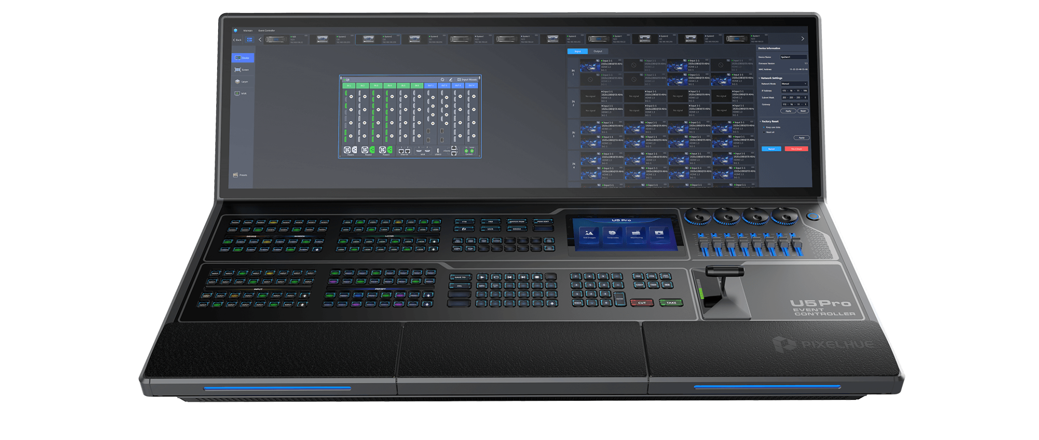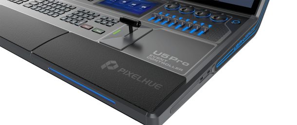 The U5 Pro is a full desk controller with an impressive integrated 43″ ultra wide touch screen and an accompanying 8″ support screen. It has an impressive array of control options powered by the built in PC; Pixelflow, Streamdeck, KVM, PTZ, Midi, TimeCode, and more.