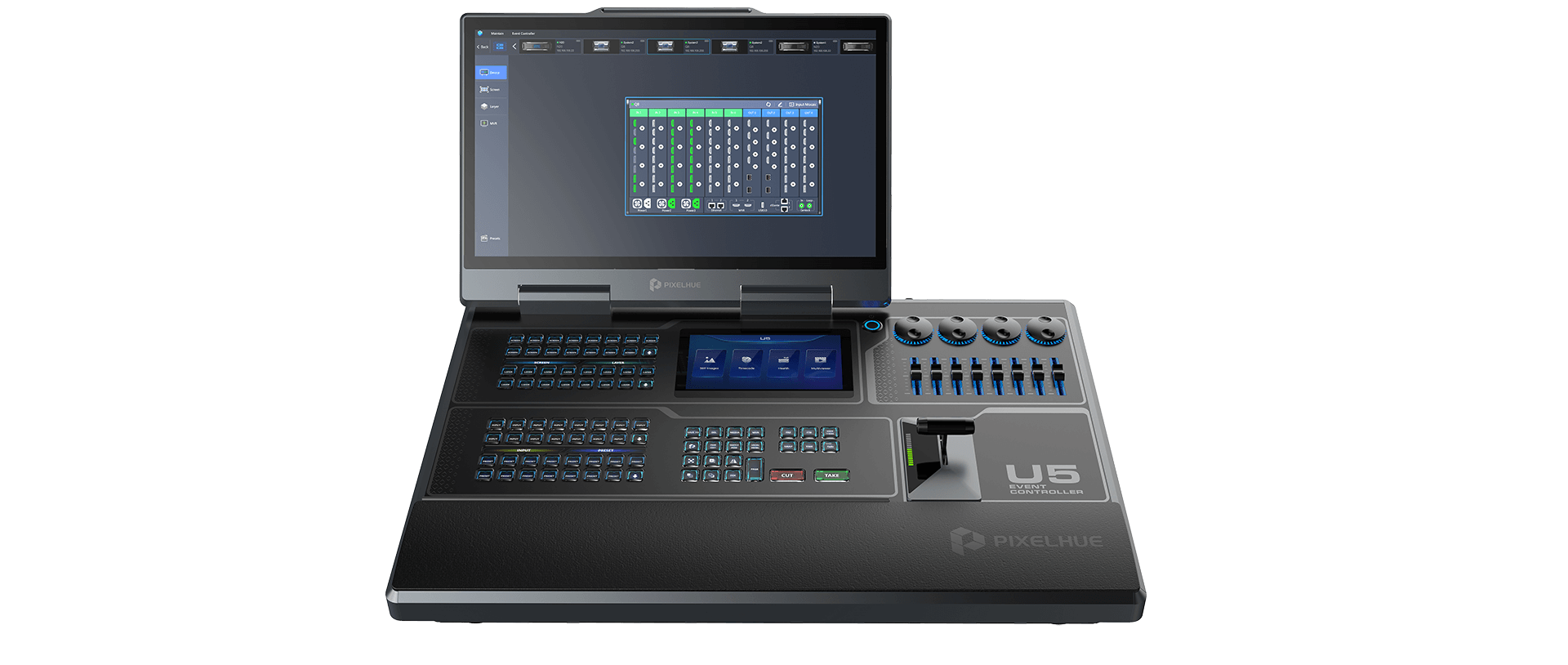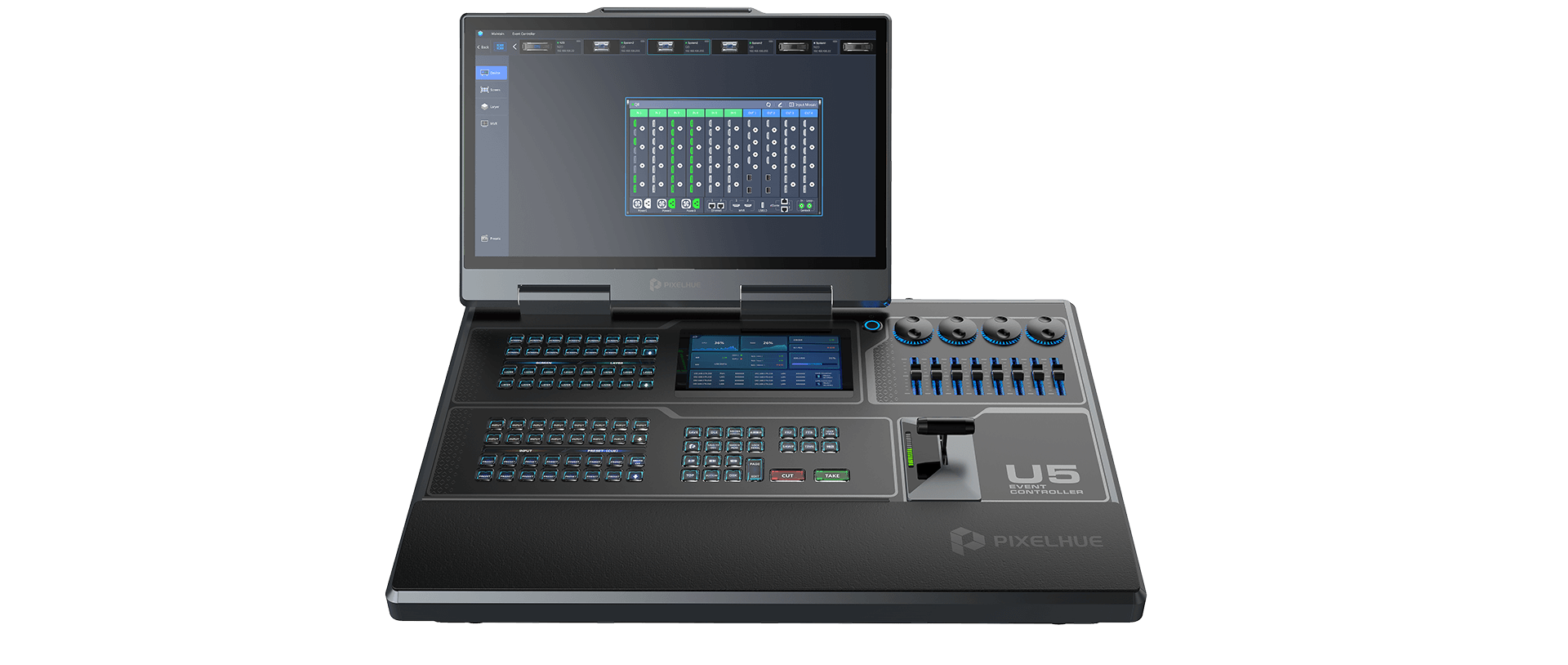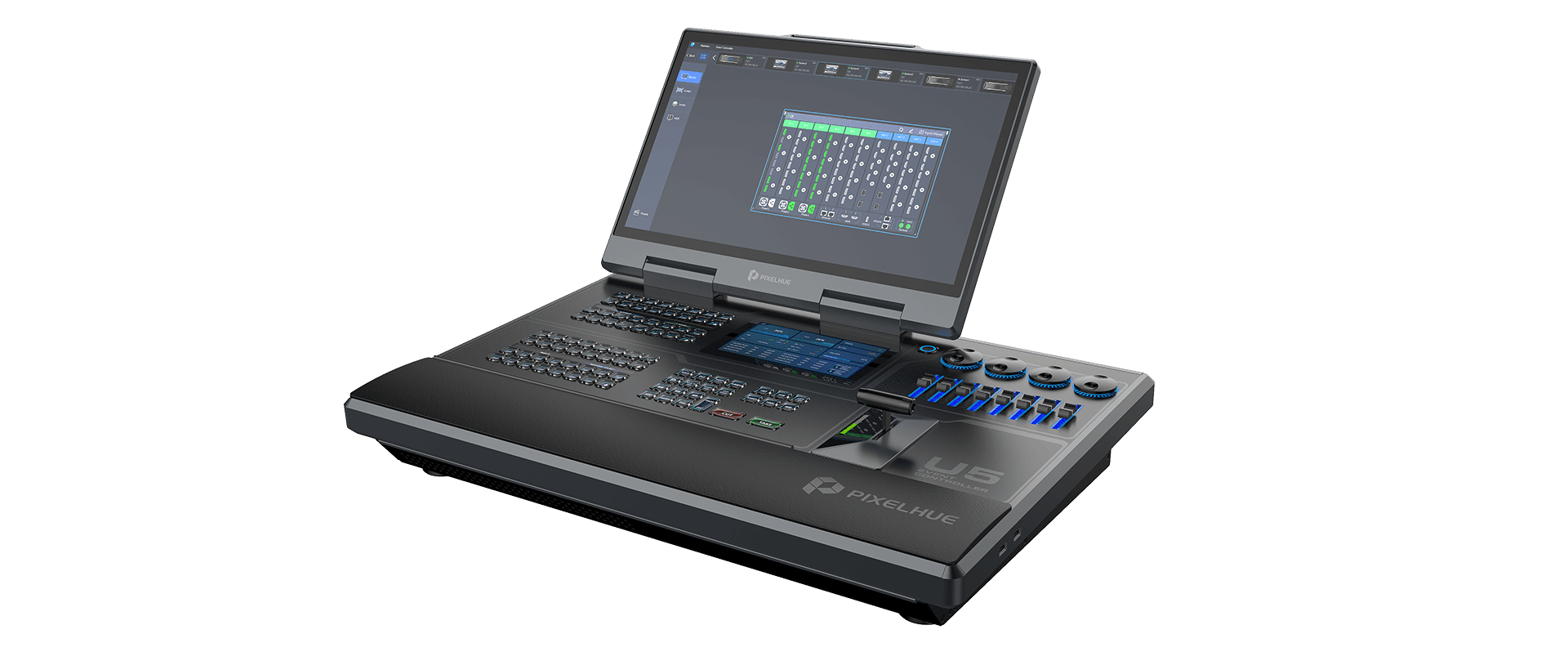 The U5 is a compact and fully featured control interface. With its built-in computer the U5 run Pixelflow natively and is capable of running third part control software such as Streamdeck. It supports TimeCode and has KVM functionality natively.
