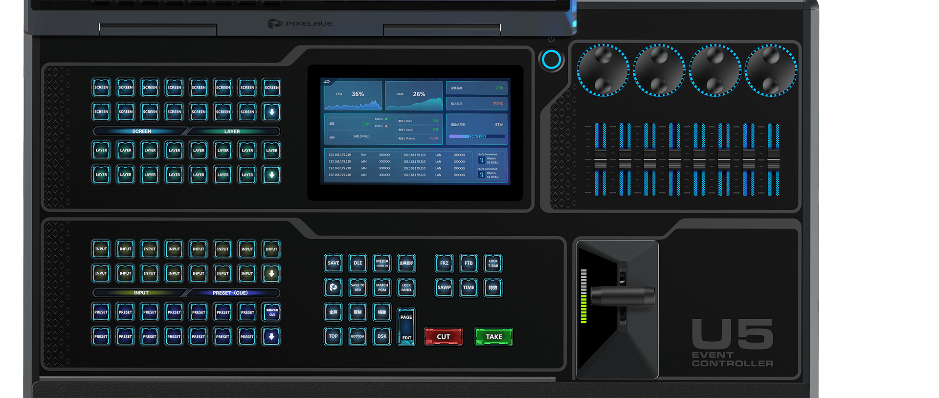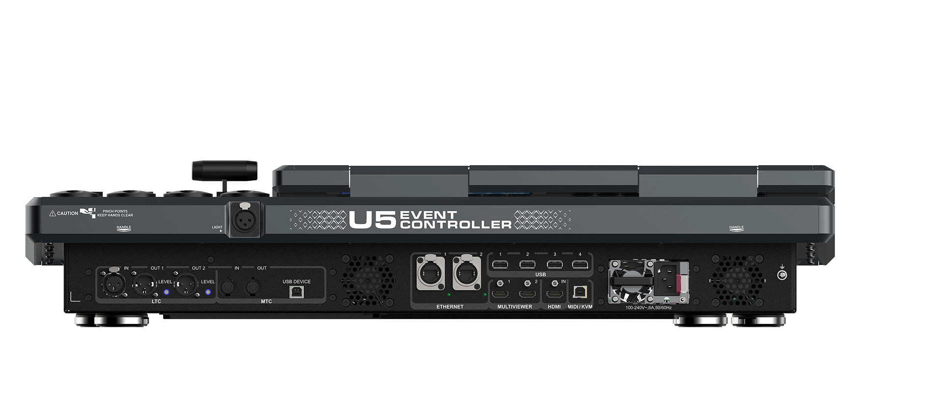 The U5 event controller comes with a compact size and lightweight ruggedized housing, 87 user-programmable LCD buttons, four encoders and eight faders, a high-resolution T-bar, etc. to bring you the maximum ease of use for your events. What’s more, the stunning design of 21.5” Main Touchscreen and 8” Smart Touchscreen enables the more visualized and convenient operations, as well as a foldable design makes it easily survive in any road trips. All these make it the perfect solution for various spectacular live events.
