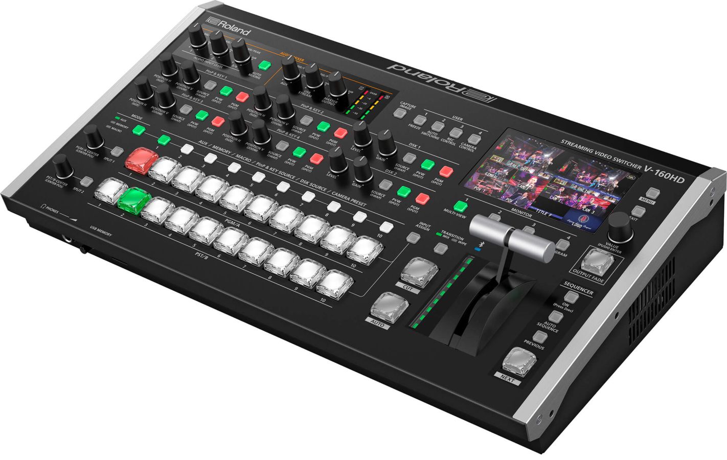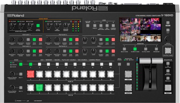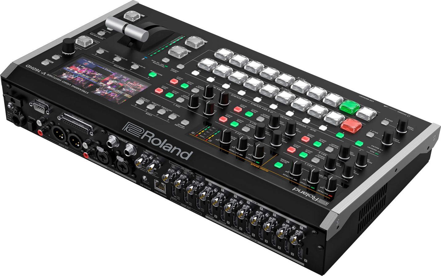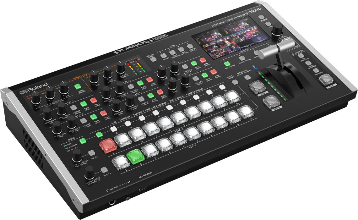 The Roland V‑160HD is a professional hybrid switcher offering eight HDMI and eight SDI inputs (with frame rate conversion), seven assignable outputs (SDI/HDMI/USB‑C), an eight-layer effects engine, 40-channel audio mixer, PTZ camera control, macros, presets, and live sequencer—ideal for hybrid event workflows